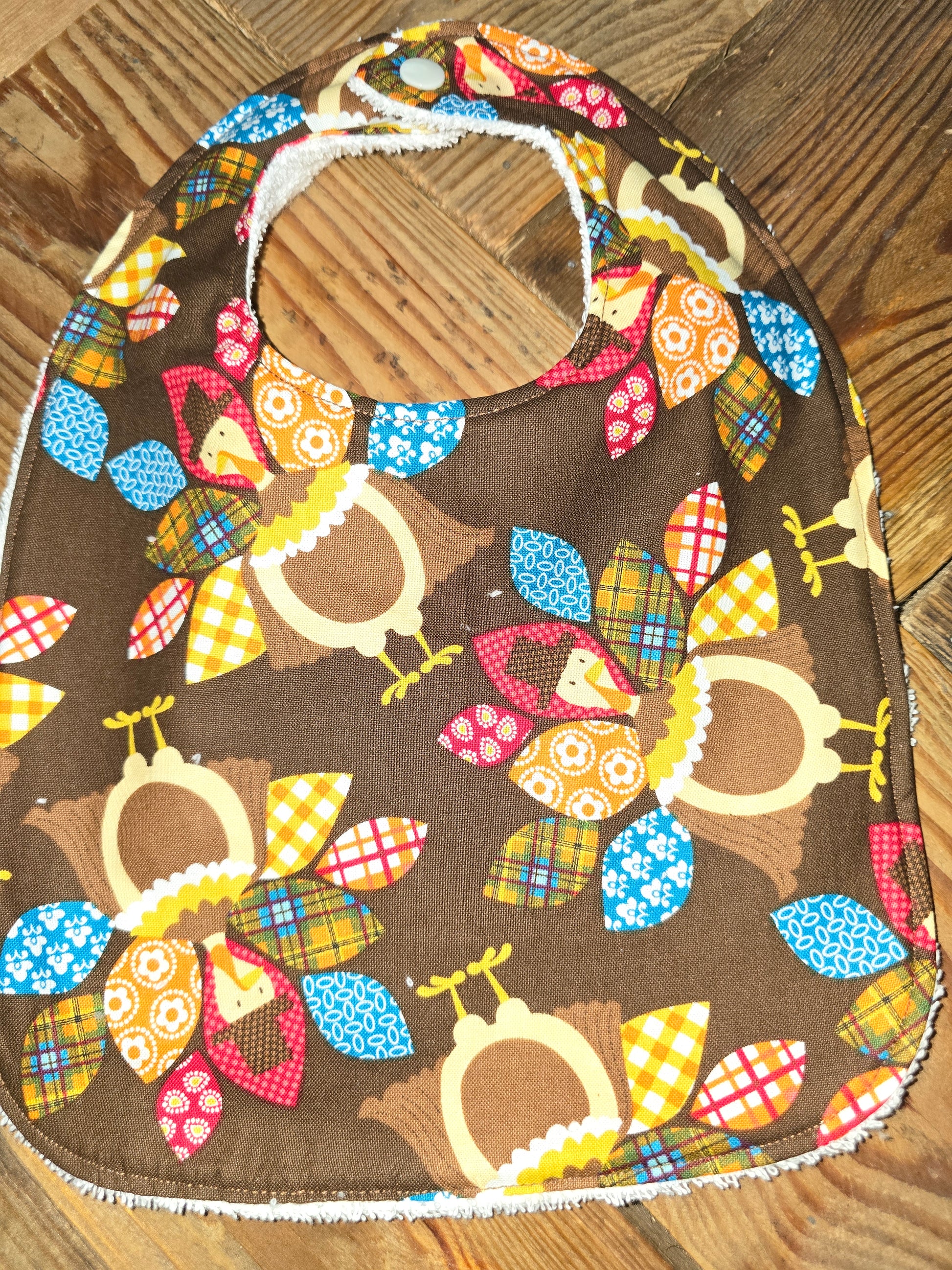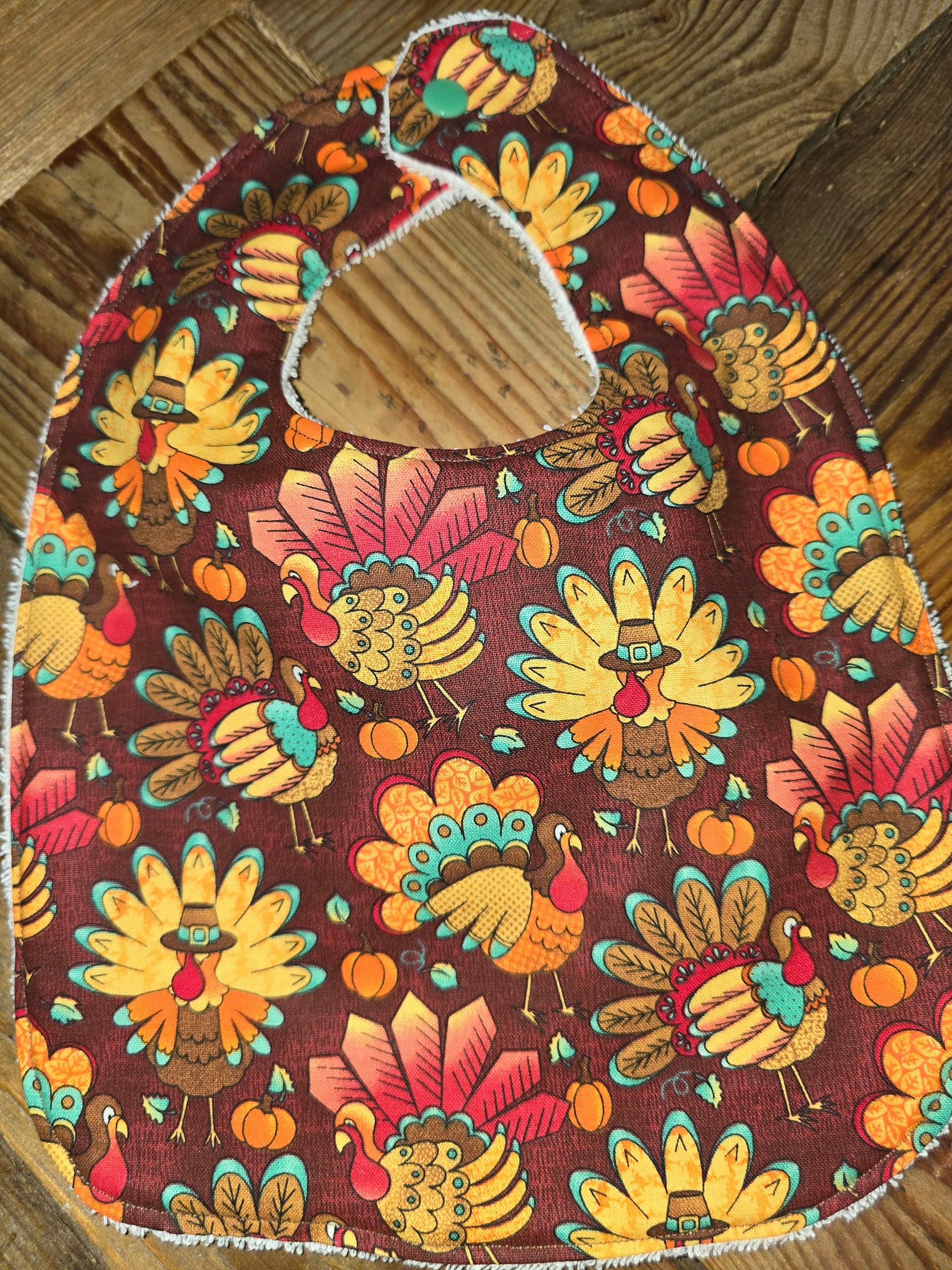 This Thanksgiving turkey themed baby bib ensures a clean and adorable holiday meal for your little turkey. Made with high-quality materials, it provides comfort and protection for your baby's clothes. Perfect for all Thanksgiving celebrations and a great gift for new parents.