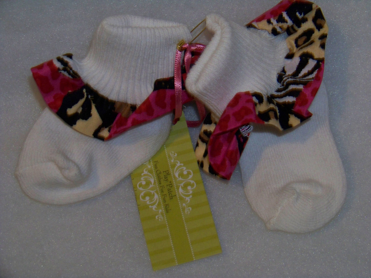 These socks would be a cute addition to your little ones wardrobe. The socks are white size 6-12 months socks embelished with an animal print ruffle.